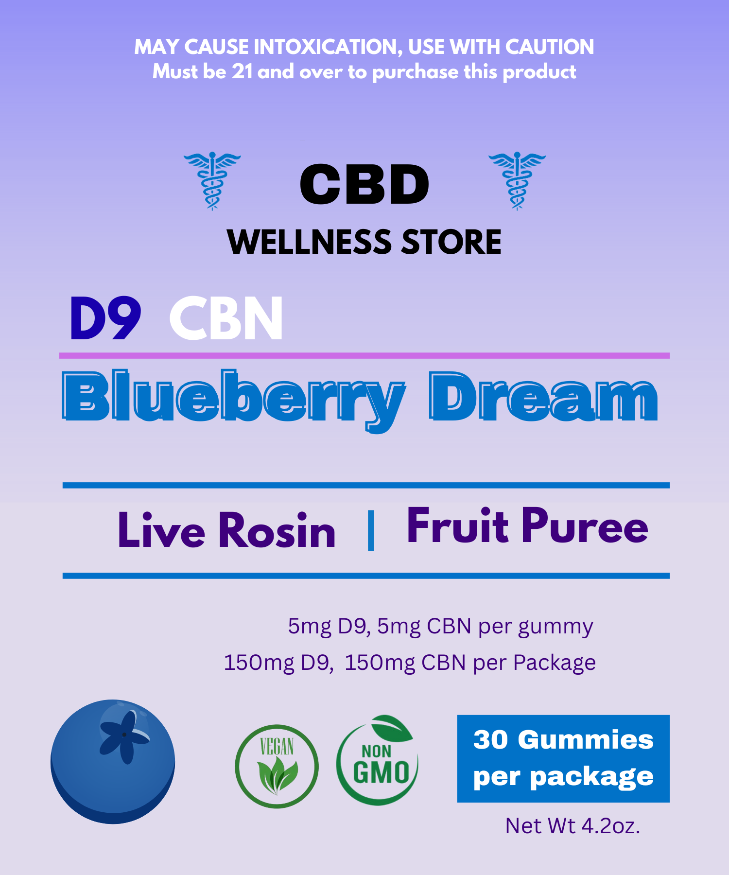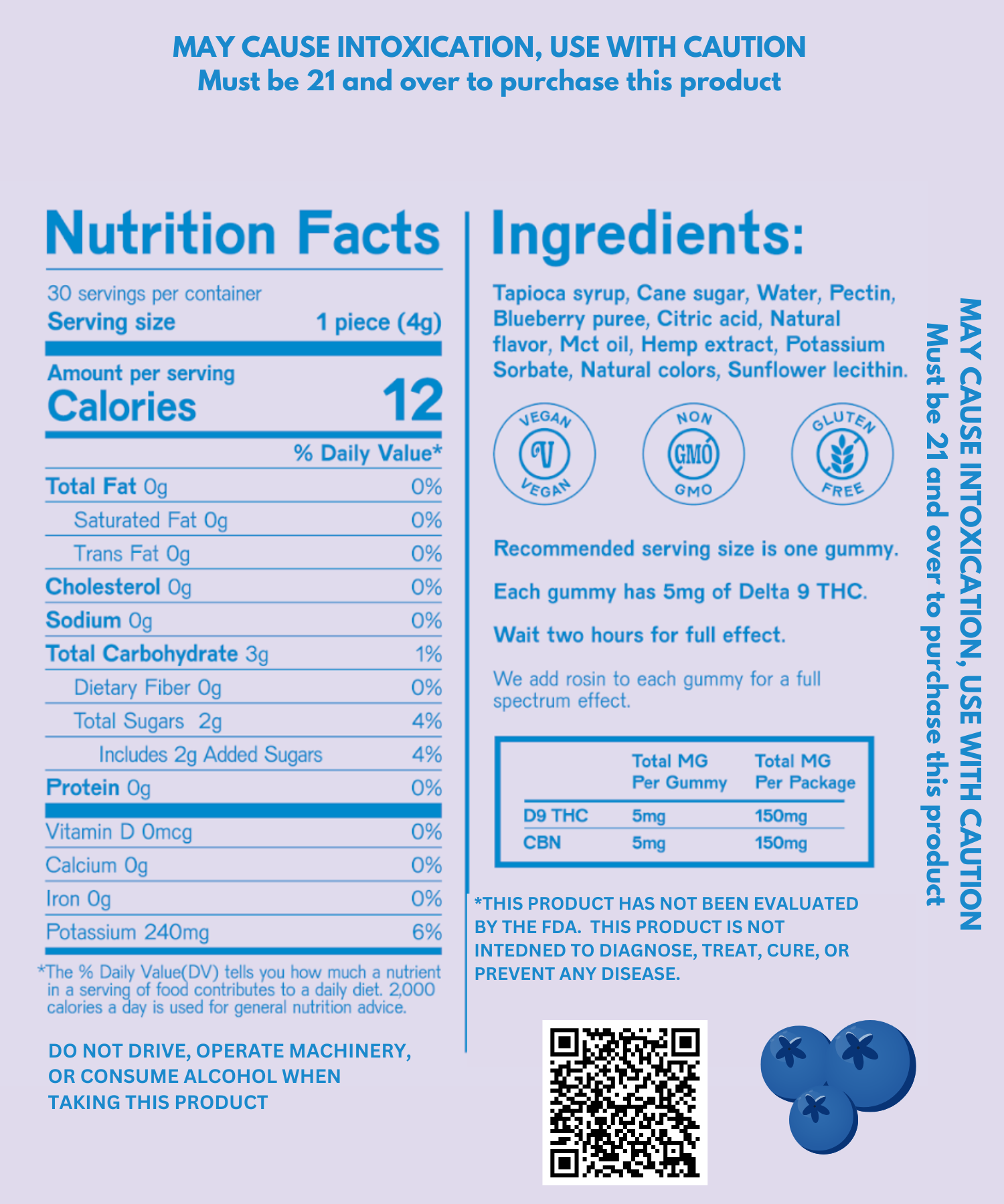 Each delicious blueberry-flavored gummy contains a carefully crafted blend of 5mg Delta 9 THC and 5mg CBN, designed to help you unwind and drift into peaceful dreams.